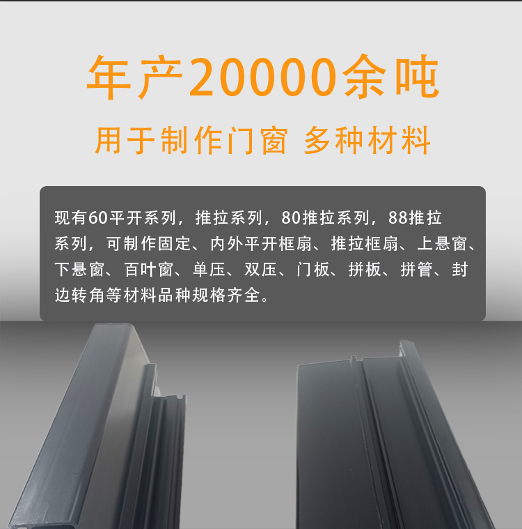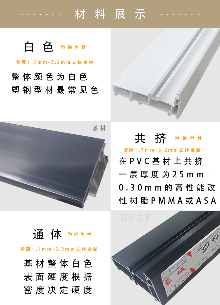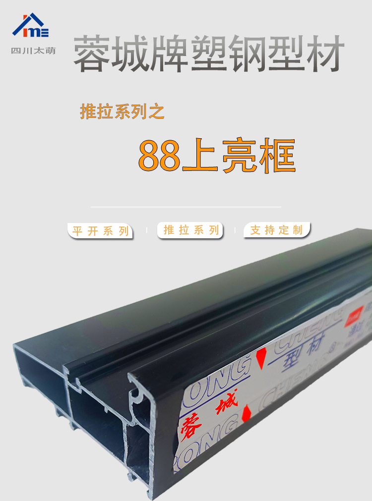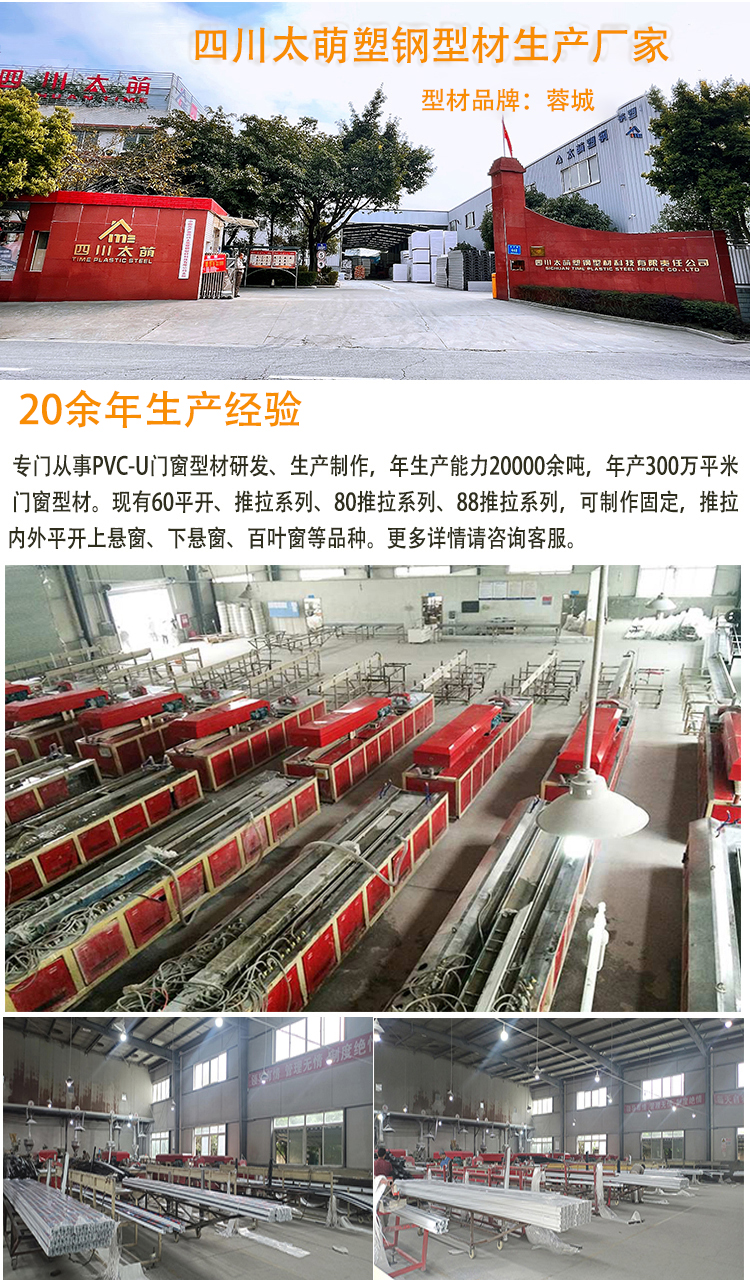 四川太萌塑钢型材生产厂家专门生产塑钢门窗型材20余年,卫浴成都市新都区,自有工厂占地30余亩,品牌有太萌,蓉城,好望、海舰等。年生产塑钢型材20000余吨,年产300万平方米门窗型材。公司开发生产的塑钢型材现有60平开、推拉系列、88推拉系列,88推拉系列,可制作固定、内外平开、推拉、上悬窗、下悬窗、百叶窗、同时有门板,单压条、双压条、90°转角、拼板、拼条、拼管、百叶条、方管、封边、盖帽等塑钢型材,常规厚度:1.7-3.2mm(支持定制),颜色有:白色,共挤、通体彩塑,一支6m