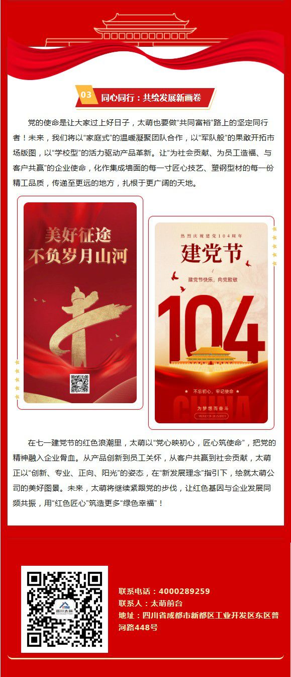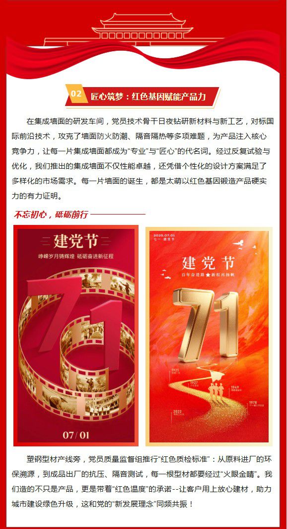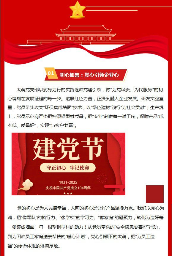 在七一建党节的光辉映照下,四川太萌公司开启了一场“红色赋能”的奋进之旅。当“为社会贡献、为员工造福、与客户共赢”的企业使命,与“像家庭、像学校、像军队”的企业文化交融,太萌以集成墙面、塑钢型材为笔,书写属于自己的“红色答卷”