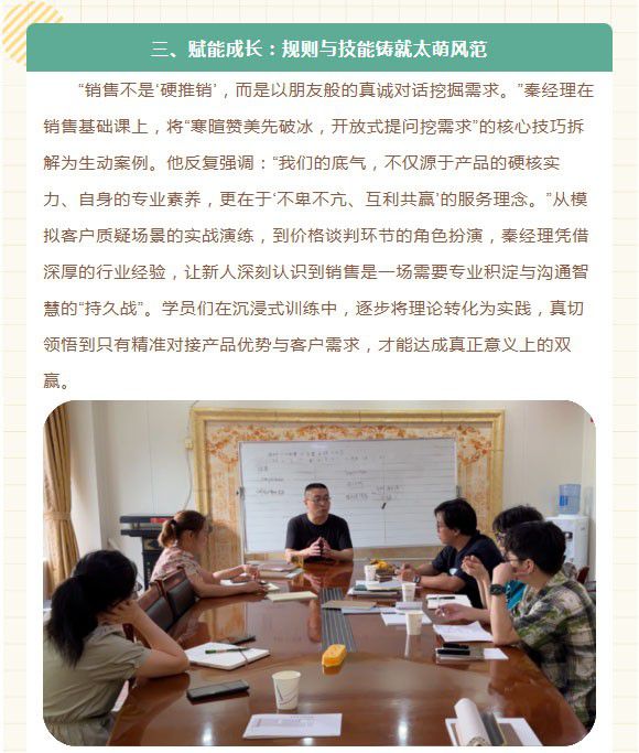 The July breeze carries the enthusiasm for growth, and the warmth surges in the cute conference room of Sichuan. The three-day training for new marketing personnel is not only an "ice breaking journey" for "newbies" to integrate into the team, but also a vivid practice of practicing the corporate culture of "like family, like school, like the military".