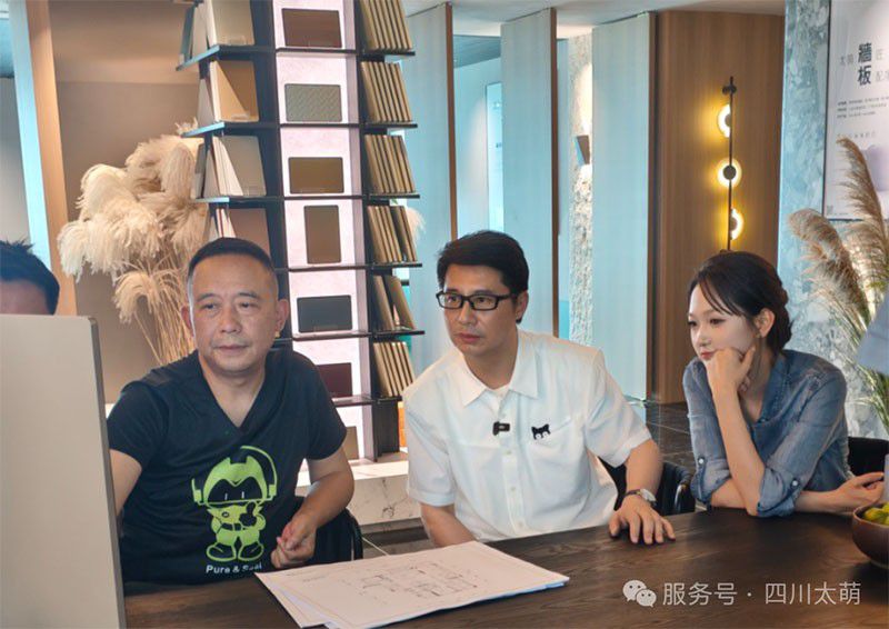 考察接近尾声,一场关于“设计与产品”的深度探讨在会议室热烈展开。赖旭东老师以《梦想改造家》中的经典案例为引,将“功能与美学”的融合之道娓娓道来,让双方对未来合作的蓝图愈发清晰。在太萌人眼中,赖旭东老师既是严谨的设计大师,也是亲切的生活家---他会俯身细察墙板拼接的细微缝隙,也能与团队成员热烈讨论不同花色在房屋改造中的适配性,言语间满是对设计的执着与热爱。正如太萌所评价:“专业不失温度,创新饱含责任,这样的设计理念,正是我们期待的共鸣。”